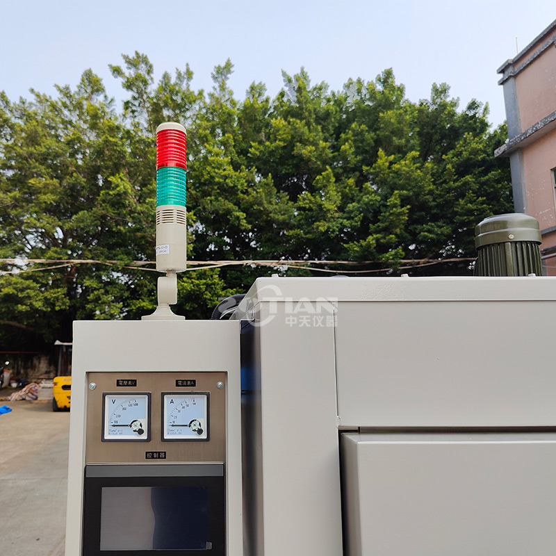 380V,三相四線制,加熱功率 9KW,配控制電箱于烤箱頂部,采用優怡觸摸屏控制器,配有 PV 和 SV 數字顯示窗口。提供 USB 接口:可記錄運行中溫度值,可下載各種測試參數信息。采用SSR 固態繼電器控制加熱器,顛覆傳統過零觸發時帶來的電流瞬間沖擊大、控溫波動大等影響,配合性價比極高的 DC24V 輸出型控制器,可使輸出電壓平穩線性變化,控溫效果更穩定,性能更穩定,使溫度更加精準,溫度由室溫+10℃-400℃可調。功能有 PID 自整定微積分控制、使溫度更加精準,控溫精度±0.5℃,內部溫度均勻性±3℃(空載測試)。自動恒溫、自動計時(配有高精度數顯計時器可調 99 小時 99 分鐘)溫度到后定時報警斷加熱、超溫報警斷加熱、電源缺相相序保護等功能,及其它正牌電器控。